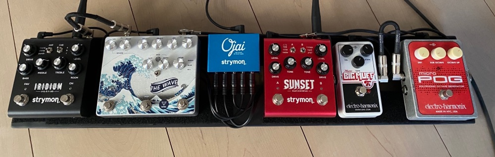 This is my first pedalboard. Andy was very very kind to give me The Wave and the Big Muff Pi and Pog, and I always coveted his Sunset. And I also copied his Iridium since it seemed appropriate. Anyway, so much fun. Good for recording and NINJAMming.